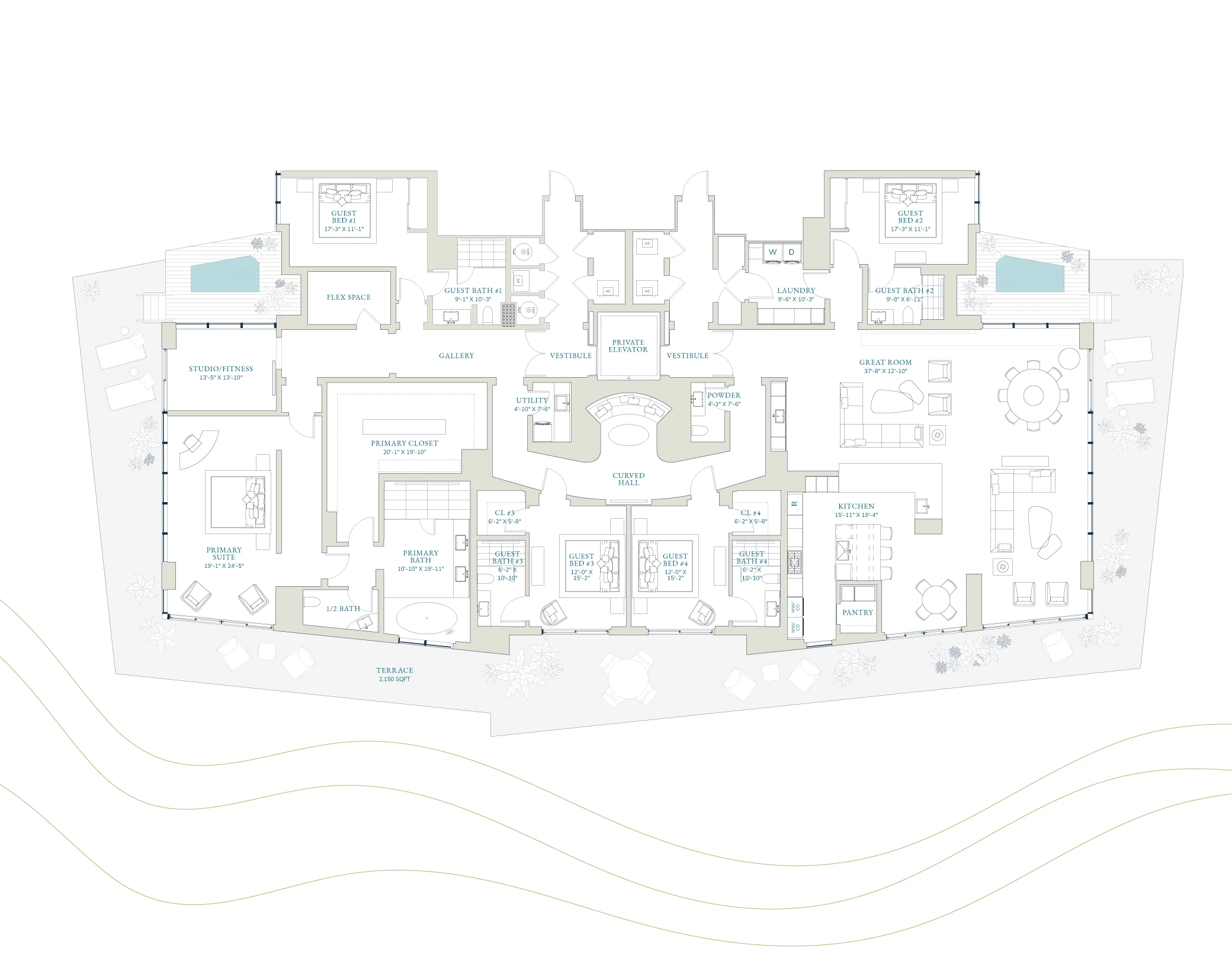 Stated dimensions are measured to the exterior boundaries of the exterior walls and the centerline of interior demising walls and in fact vary from the dimensions that would be determined by using the description and definition of the "Unit" set forth in the Declaration (which generally only includes the interior airspace between the perimeter walls and excludes interior structural components. Note that measurements of rooms set forth on this floor plan are generally taken at the greatest points of each given room (as if the room were a perfect rectangle), without regard for any cutouts. Accordingly, the area of the actual room will typically be smaller than the product obtained by multiplying the stated length times width. All dimensions are approximate and may vary with actual construction, and all floor plans and development plans are subject to change.