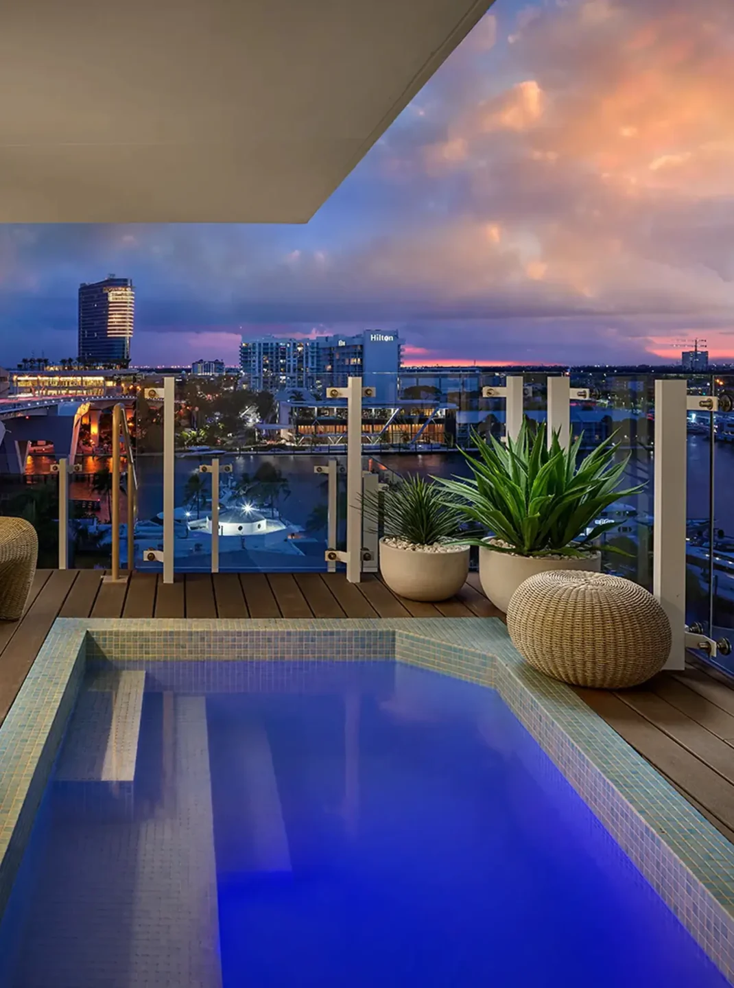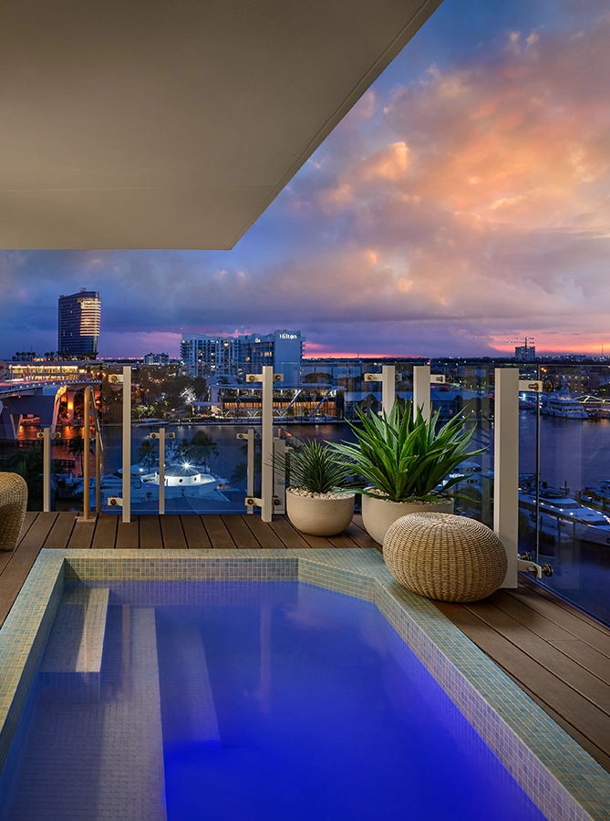 - Dynamic, multi-level, marina-front pool deck with tropical landscaping, cabana seating, art installations, entertainment, and food and beverage offerings
